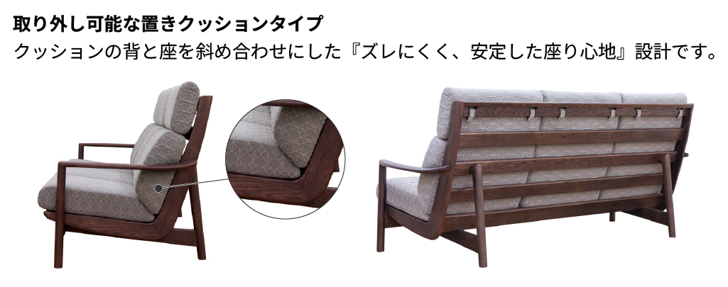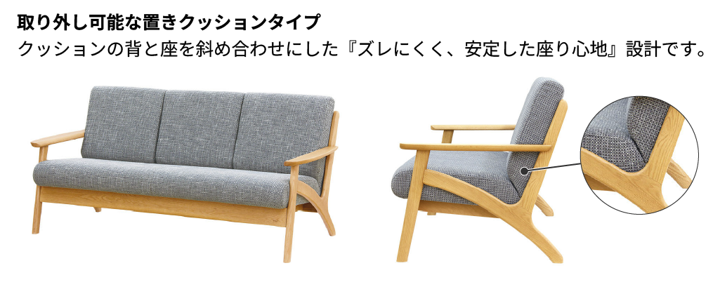 取り外し可能な置きタイプクッションですが、クッションの背と座を斜め合わせにした『ズレにくく、安定した座り心地』を実現したソファ😆